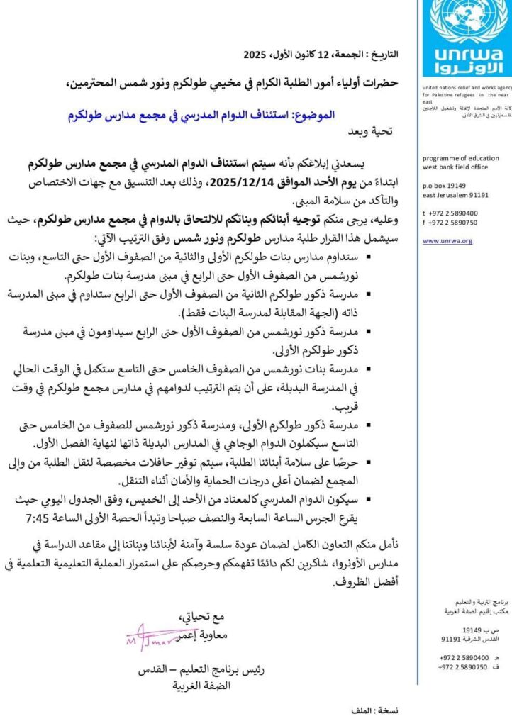 وأوضحت الوكالة، في تعميم موجّه إلى أولياء أمور الطلبة في مخيمي طولكرم ونور شمس، أن عودة الطلبة ستكون وفق ترتيبات محددة تضمن سلامتهم واستمرارية العملية التعليمية، حيث سيتم التحاق الطلبة بالدوام وفق التوزيع المعتمد لكل مدرسة.