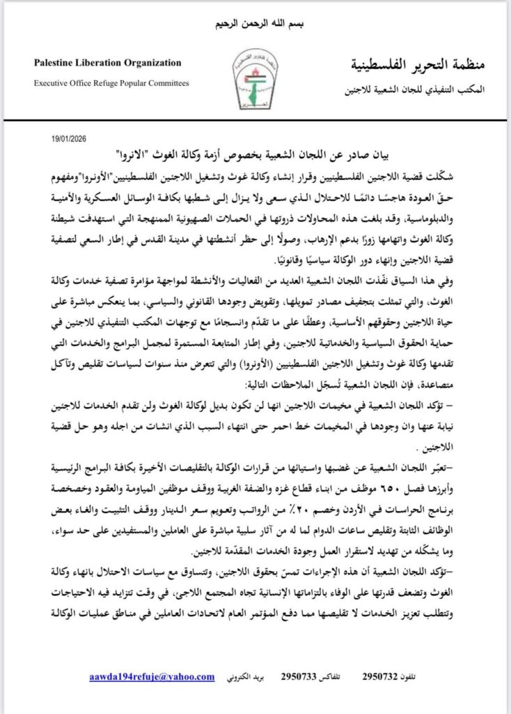 في أعقاب اجتماع المكتب التنفيذي للجان الشعبية في مخيمات اللاجئين في الضفة الغربية، صدر اليوم بيان تناول أزمة وكالة غوث وتشغيل اللاجئين الفلسطينيين (الأونروا)، في ظل ما تشهده من تقليصات وإجراءات تمسّ جوهر خدماتها ودورها السياسي والإنساني.