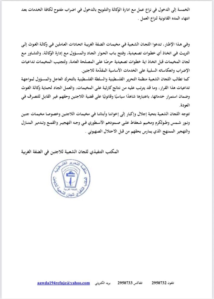 وفي هذا الإطار، تدعو اللجان الشعبية في مخيمات الضفة الغربية اتحادات العاملين في وكالة الغوث إلى التريث في اتخاذ أي خطوات تصعيدية، وفتح باب الحوار الجاد والمسؤول مع إدارة الوكالة، والتشاور مع لجان المخيمات قبل اتخاذ أي خطوات تصعيدية حرصًا على المصلحة العامة، وتجنب المخيمات تداعيات الإضراب وانعكاساته السلبية على الخدمات الأساسية المقدمة للاجئين.