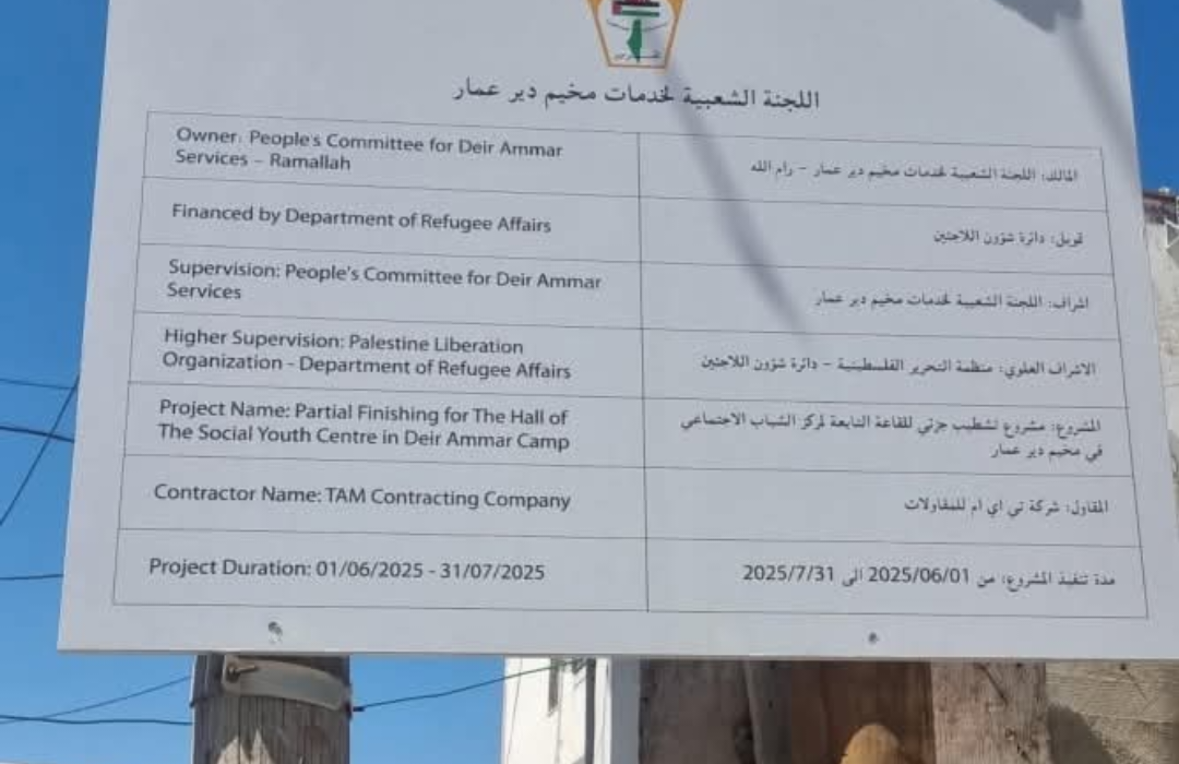بدأت دائرة شؤون اللاجئين في منظمة التحرير الفلسطينية، وبالتعاون مع اللجنة الشعبية في مخيم دير عمّار، تنفيذ مشروع إعادة تأهيل الطابق الأول في مركز الشباب الاجتماعي داخل المخيم.
