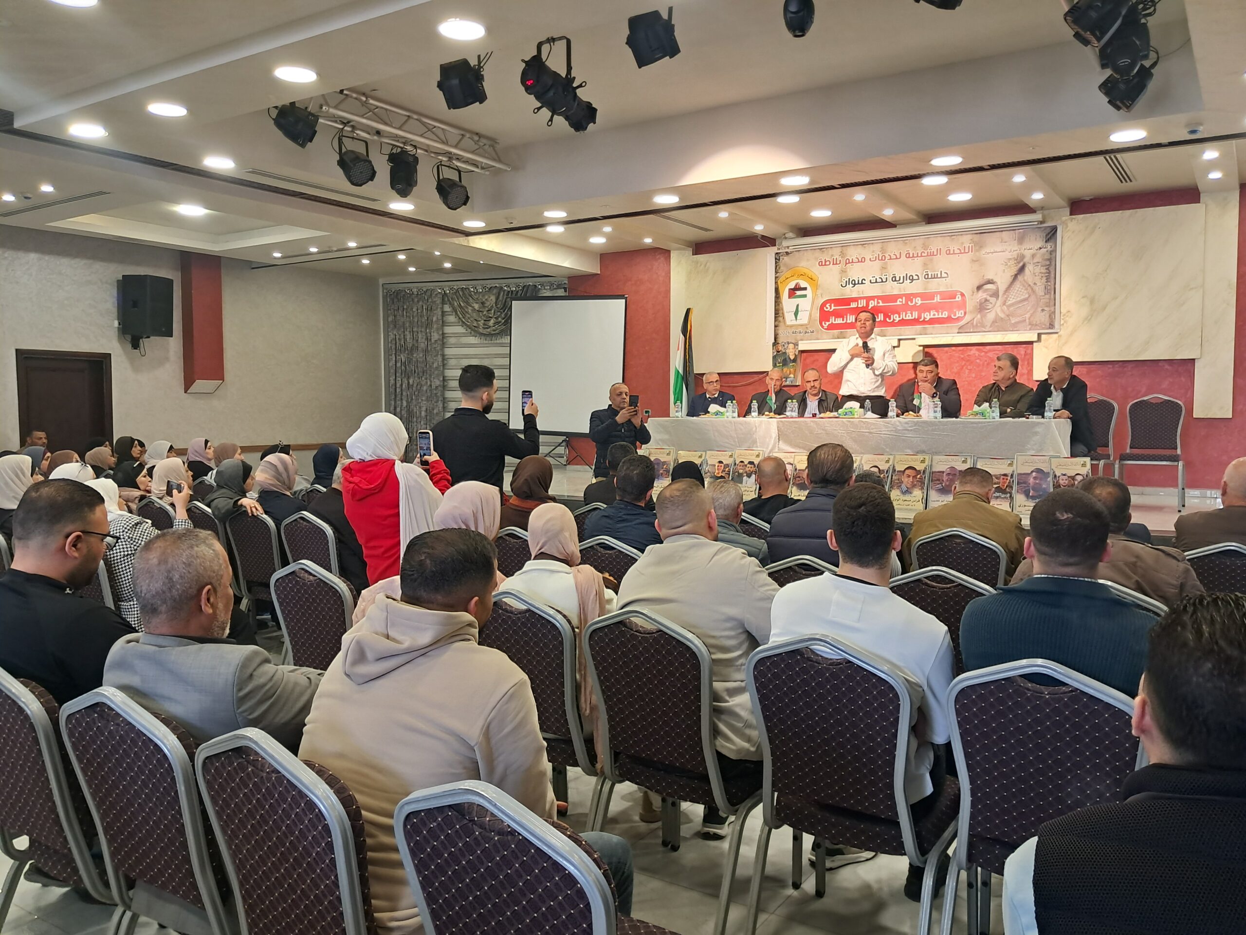 عقدت اللجنة الشعبية لخدمات مخيم بلاطة، اليوم الثلاثاء الموافق 14/4/2026، جلسة حوارية سياسية بعنوان: “قانون إعدام الأسرى من منظور القانون الدولي الإنساني”، وذلك في قاعة “سفن دريمز” في سهل بلاطة، بحضور المحامي أيمن عودة، رئيس تحالف الجبهة العربية للتغيير، وعدد من الشخصيات السياسية والقانونية والأكاديمية، إلى جانب عدد من المهتمين وأبناء المخيم.