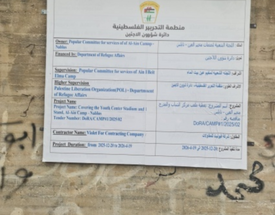 بدأت دائرة شؤون اللاجئين في منظمة التحرير الفلسطينية، تنفيذ مشروع تغطية ملعب مركز الشباب الاجتماعي والمدرج في مخيم العين، وذلك.